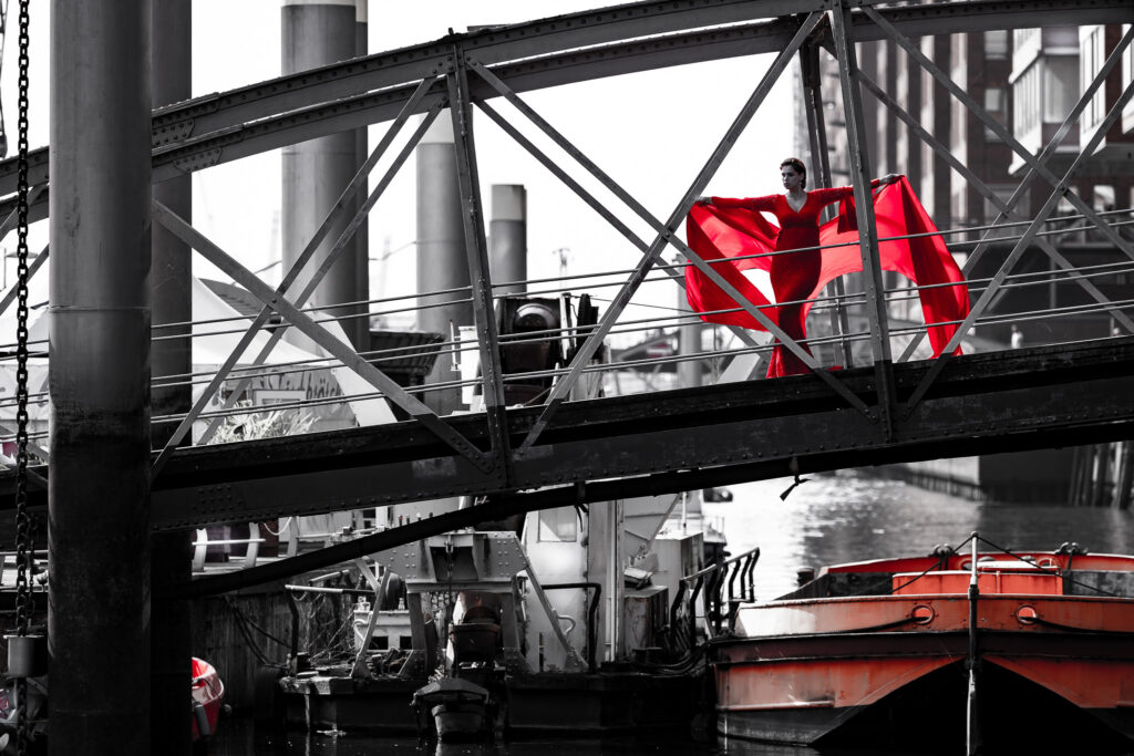 Dieses Projekt heißt RED und soll zeigen, das man seine reale Umgebung in einer digitalen Welt wahrnehmen soll. Rote auffällige Akzente in einer grauen metallischen Welt. Die Aufmerksamkeit soll immer auf das rote Kleid gelenkt werden, da wir sehr häufig in der Reizüberflutung des Alltags untergehen.